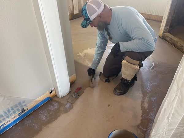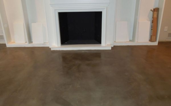 Concrete overlays came out when Decorative Concrete started meeting some challenges when existing concrete slab conditions or other substrates were not meeting the design needs or aesthetics of a commercial space or interior of a home. Underlaymenst have always been around as a means to patch, skim or float out concrete that was damaged so that floor coverings could be laid over the top. When concrete has damage or a lot of repairs, the appearance may not be so attractive. Cracks, tack-strip holes, plumbers trenches, electrical cutouts and stains or ghost lines can cause permanent damage to a concrete floor altering the beauty of a natural looking slab forever. Above is Jeremy Redig of FloorRescue® is applying a micro-top overlay before staining and sealing on a residential project in Texas. This floor was originally stained concrete and moisture issues present causing efflorescence and concrete damage. See project photos here.