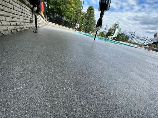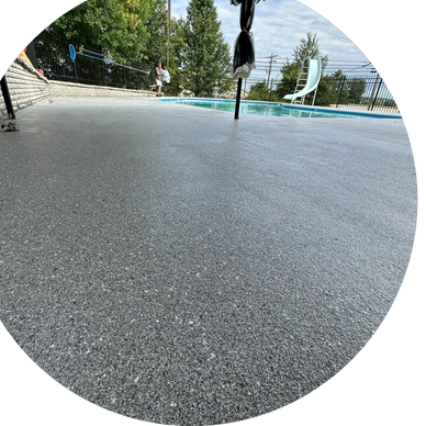 Customizable epoxy floors for exteriors, using UV stable, poly technology and unique chip blends for designing your space. Slip resistance and chemical resistance is important for areas around pools and outside in the environment.