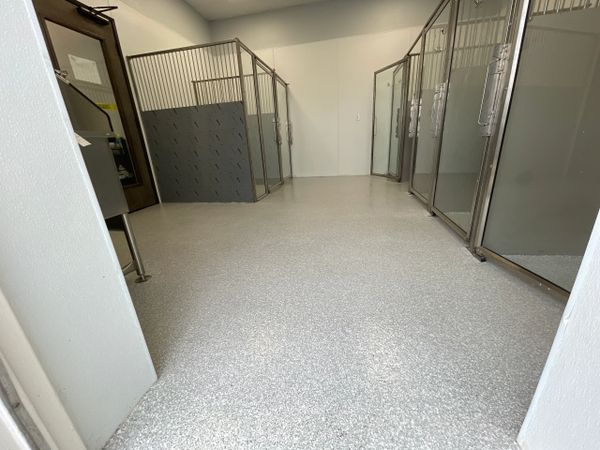Commercial epoxy floors for chemical resistance, abrasion resistance, and easy to clean wet areas. Great for commercial veterinary clinics and animal wellness sinners make the day-to-day operations low maintenance.